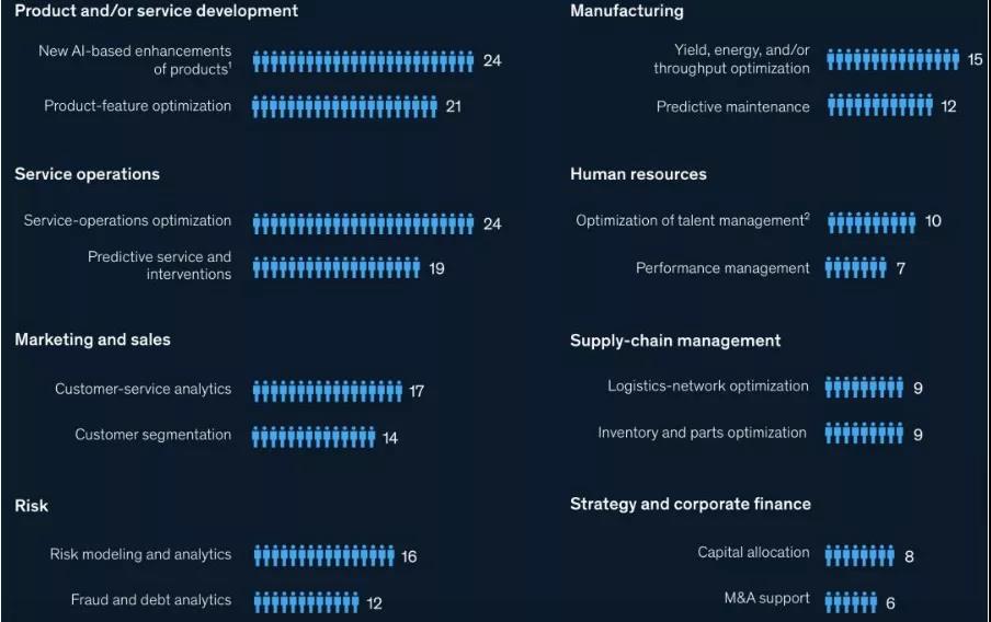 從公司內(nèi)部業(yè)務(wù)線(xiàn)看,下圖顯示了各部門(mén)的AI使用率(單位:%):