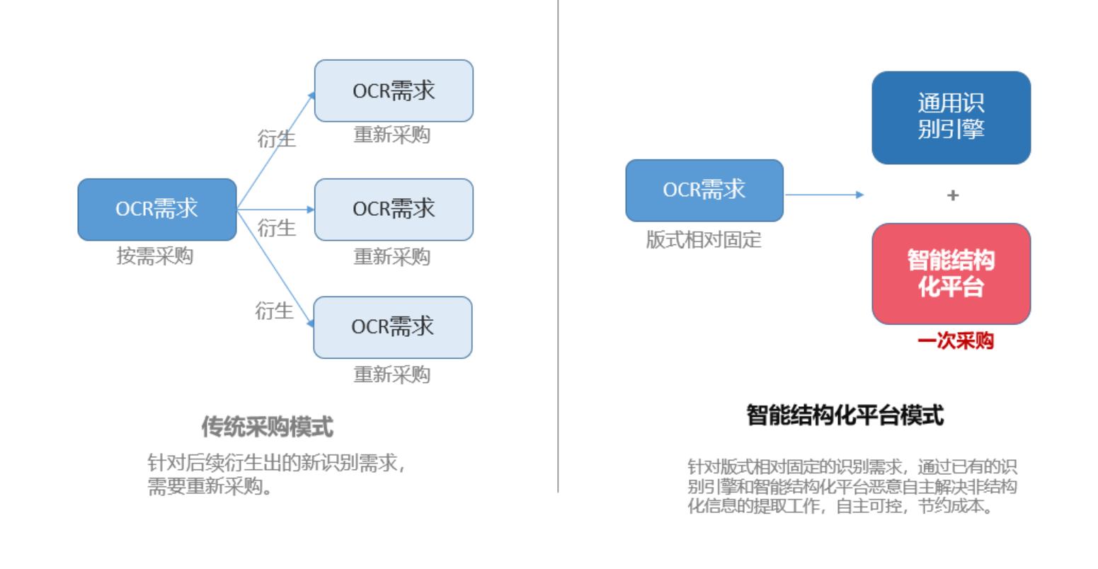 智能結構化平臺使得行方后續針對板式相對固定的待識別憑證,可以通過已有的通用識別引擎和智能結構化平臺可以自主解決非結構化信息的提取工作,達到自主可控和節省成本的目的,解決行方新板式OCR識別需要從新采購及定制開發的工作。