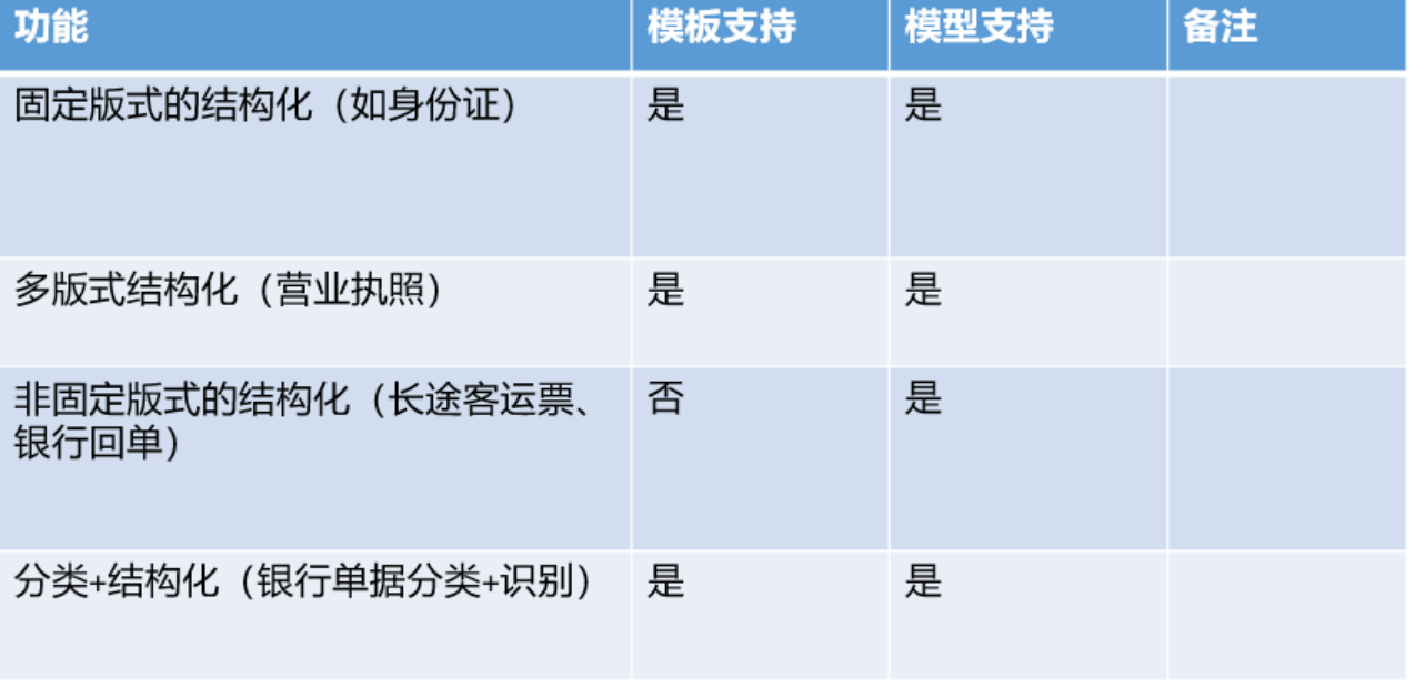 智能結構化平臺用于訓練產生針對各種不同版式的OCR識別引擎,滿足銀行自動化、專業化、模塊化、高性能等業務及技術要求,支持身份證、銀行卡等固定版式的結構化,營業執照等多版式的結構化,銀行回單、長途客運票等非固定版式的結構化,支持銀行單據分類+識別等分類結構化。總而言之,可以支持銀行80%OCR識別需求的自研能力。