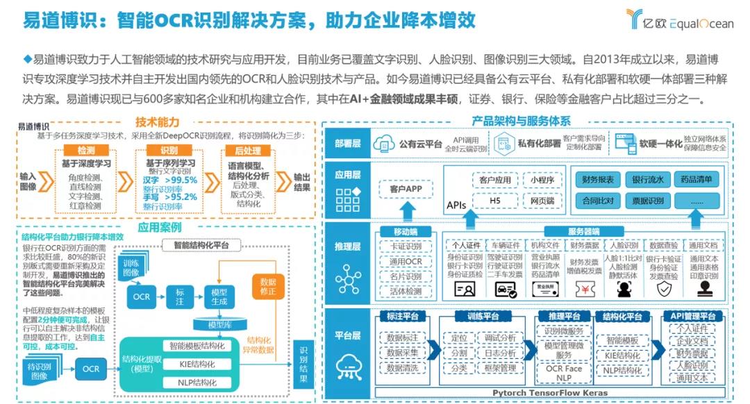 作為AI與金融結(jié)合的成功商業(yè)案例,易道博識在核心技術(shù)保持高強度投入,一直專注致力于人工智能領(lǐng)域的技術(shù)研究與應用開發(fā),立足服務于銀行、證券、保險等行業(yè)領(lǐng)域,圍繞支撐業(yè)務建立了從平臺層、推理層、應用層到部署層的完整產(chǎn)品架構(gòu)和服務體系。