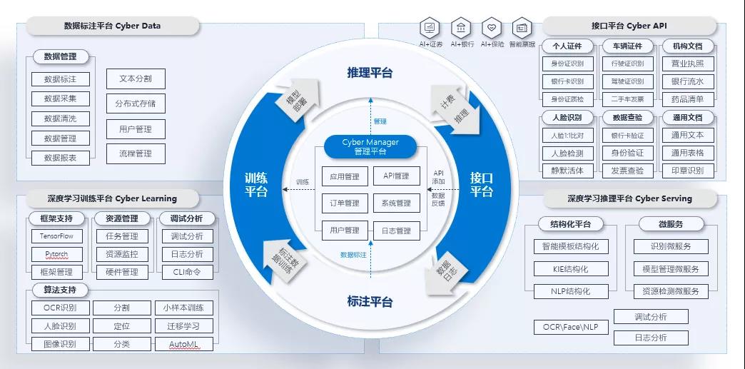 賽博(Cybot)學習平臺(簡稱平臺)是易道博識基于深度學習自主研發的一站式全周期數據服務平臺。平臺包含Cyber Data數據標注平臺、Cyber Learning深度學習訓練平臺、Cyber Serving深度學習推理平臺、Cyber API 接口平臺、Cyber Manager管理平臺5大平臺,涵蓋數據標注,數據訓練、推理服務三大數據服務環節。