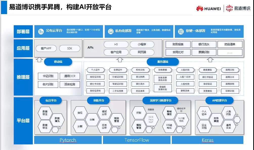 從 2020 年至今,易道博識與華為建立了密切的合作關系。憑借易道博識對深度學習和OCR識別技術的持續研發和推廣,不僅與華為在產品上達成兼容,還基于各自領域的技術與資源優勢,在解決方案層上積極探索實踐,從技術到產品再到解決方案,做到了技術共享、業務互補、區域共贏。
