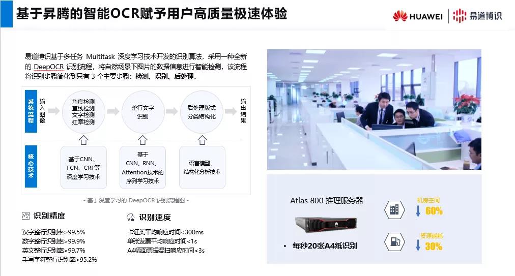 其中,在易道博識和華為昇騰合作開發的Atlas系列推理服務器中,易道博識的Deep OCR深度學習核心算法,為Atlas 800推理服務器提供了“每秒20張A4紙”量級的文本識別能力,因性能提高帶來的資源節省使得機房空間下降了60%,資源能耗下降了30%。