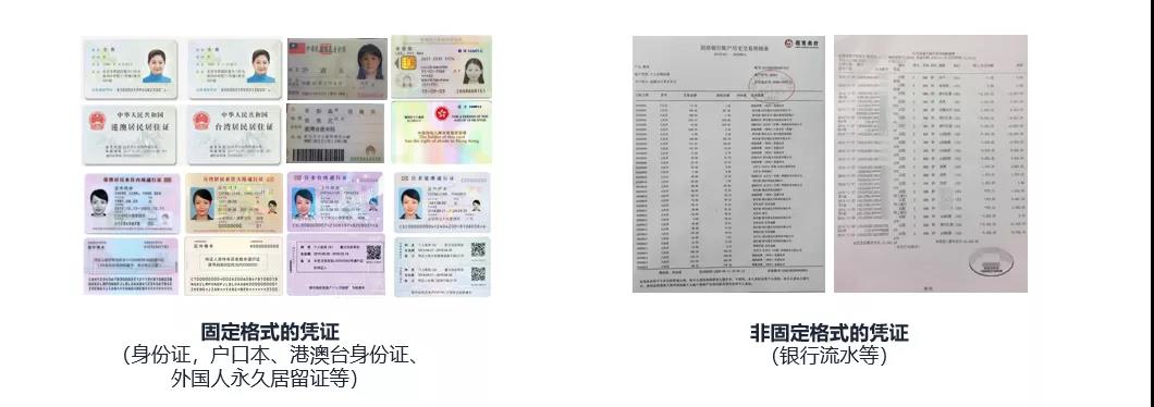 這些憑證影像按照格式可以分為兩類:一類是固定格式的憑證(戶口本、港澳臺身份證、外國人永久居留證等);一類是非固定格式的憑證(銀行流水等)。其中固定格式業務類憑證占行內90%以上,這些憑證存在以下特點: