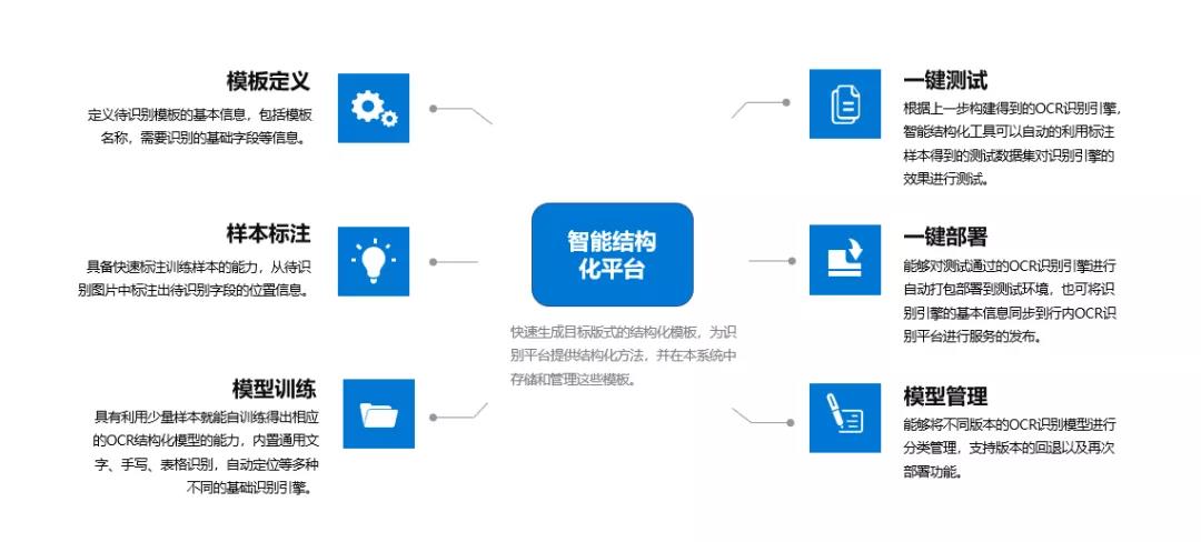 智能結構化平臺用于訓練產生針對各種不同版式的OCR識別引擎,滿足銀行自動化、專業化、模塊化、高性能等業務及技術要求,支持身份證、銀行卡等固定版式的結構化,營業執照等多版式的結構化,銀行回單、長途客運票等非固定版式的結構化,支持銀行單據分類+識別等分類結構化。