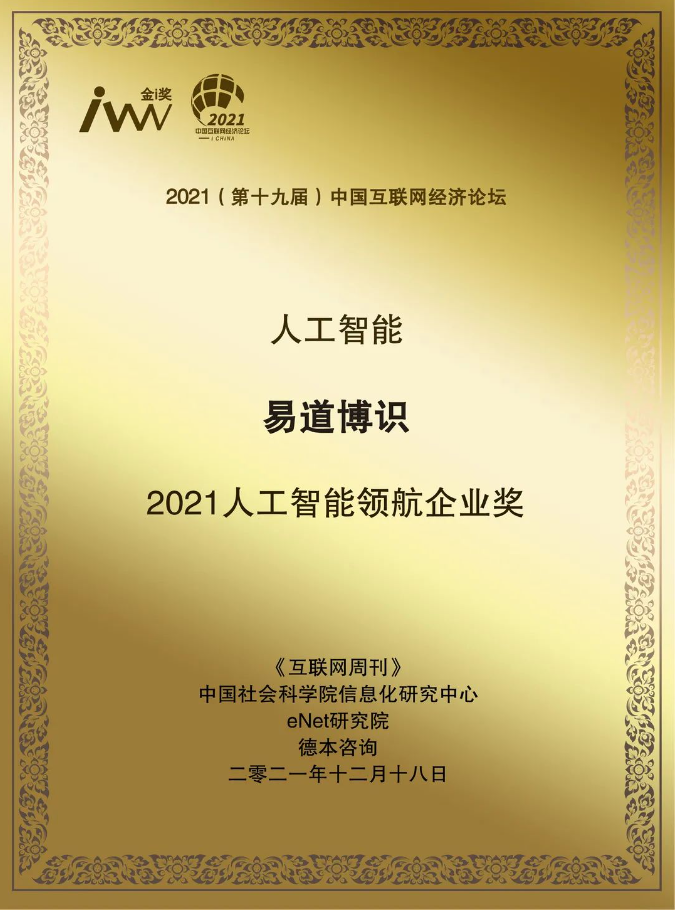 12月18日,由中國科學院《互聯網周刊》、中國社會科學院信息化研究中心、eNet研究院、德本咨詢聯合主辦的2021(第十九屆)中國互聯網經濟論壇正式拉開帷幕,備受矚目的年度金i獎獲獎名單也最終揭曉。易道博識憑借業界領先的產品創新及用戶服務,成功獲評“2021人工智能領航企業獎”。