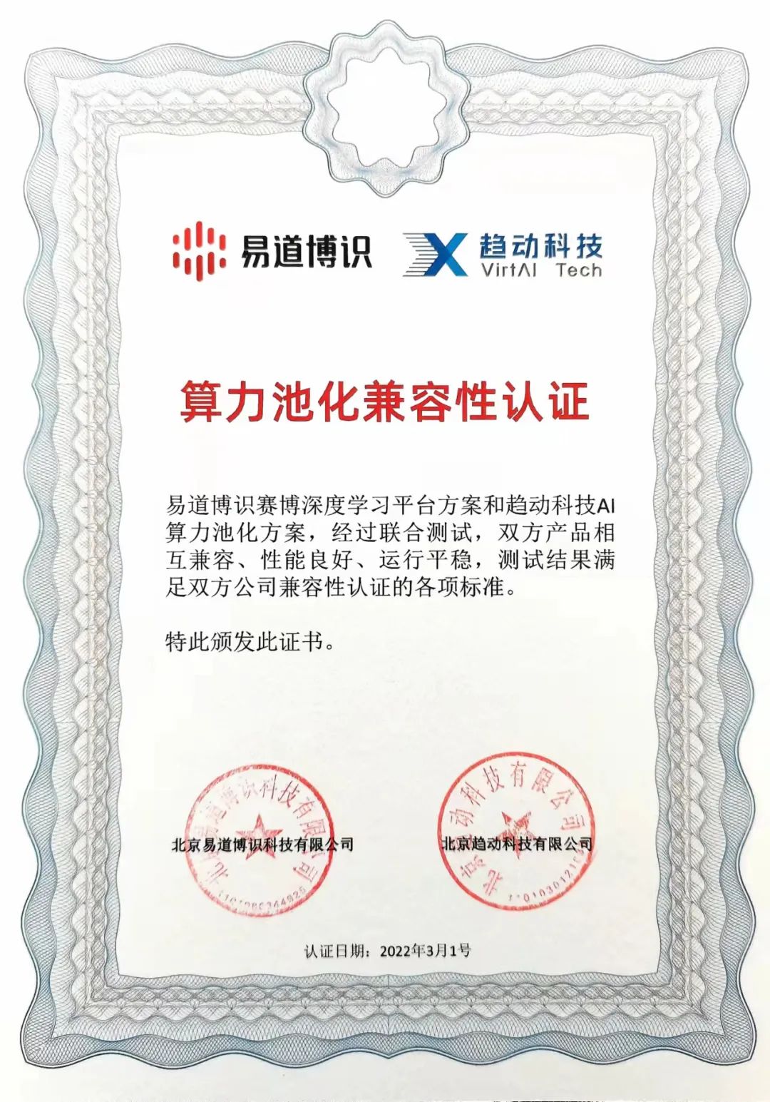 近日,易道博識CyberBot賽博學習平臺與趨動科技OrionX?AI算力池化方案經過聯合測試,雙方產品相互兼容,性能良好,測試結果滿足雙方公司兼容性認證的各項標準,決定聯合推廣打包解決方案,共同提供最大客戶價值。