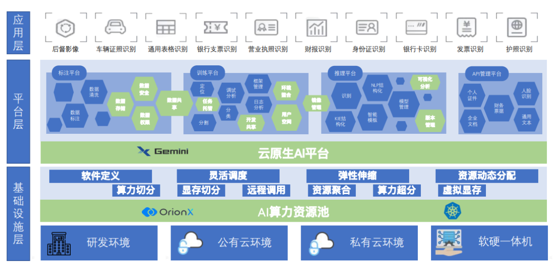 通過與趨動科技方案的融合,一方面,易道博識架構體系的基礎設施層可以通過OrionX池化方案實現云原生級資源池化管理,提高資源利用率,實現產品異構算力部署。另一方面,平臺層通過Gemini連接標注平臺、訓練平臺及推理平臺,增強了平臺的賦能能力,AI研發效率得到進一步提升,加速了CyberBot應用產品迭代。