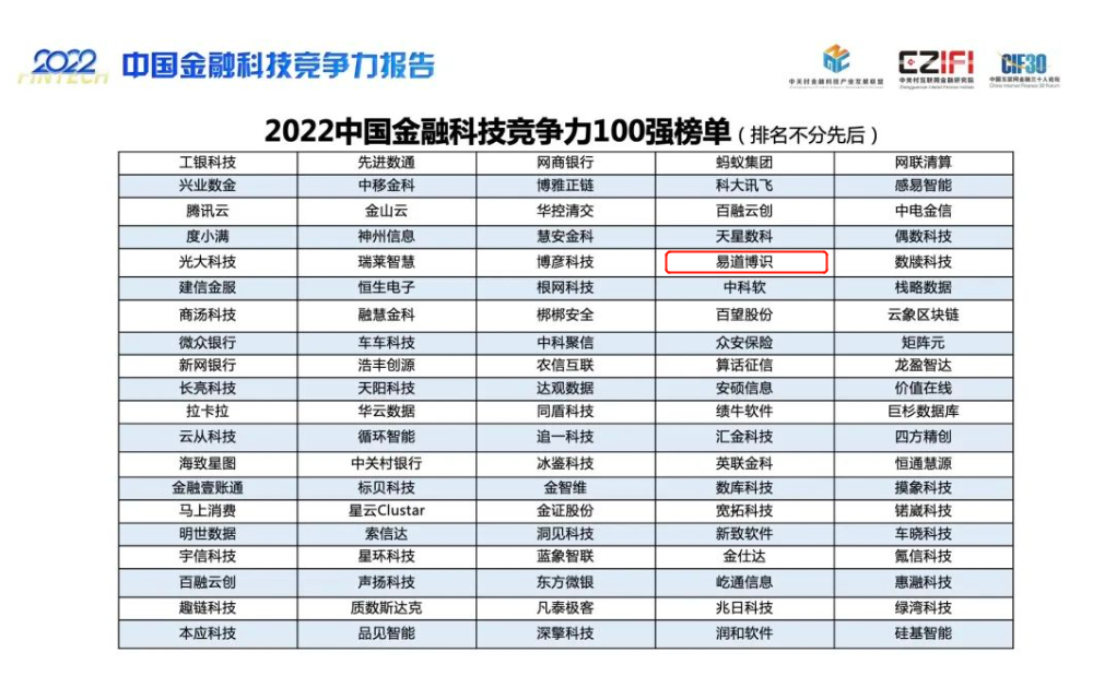 近日,由中關村金融科技產業(yè)發(fā)展聯盟、中關村互聯網金融研究院和中國互聯網金融三十人論壇主辦的“2022第六屆金融科技與金融安全峰會”在京成功召開。會上,《2021中關村金融科技30強榜單》和《2022中國金融科技競爭力100強榜單》雙雙出爐,易道博識實力入選雙榜!