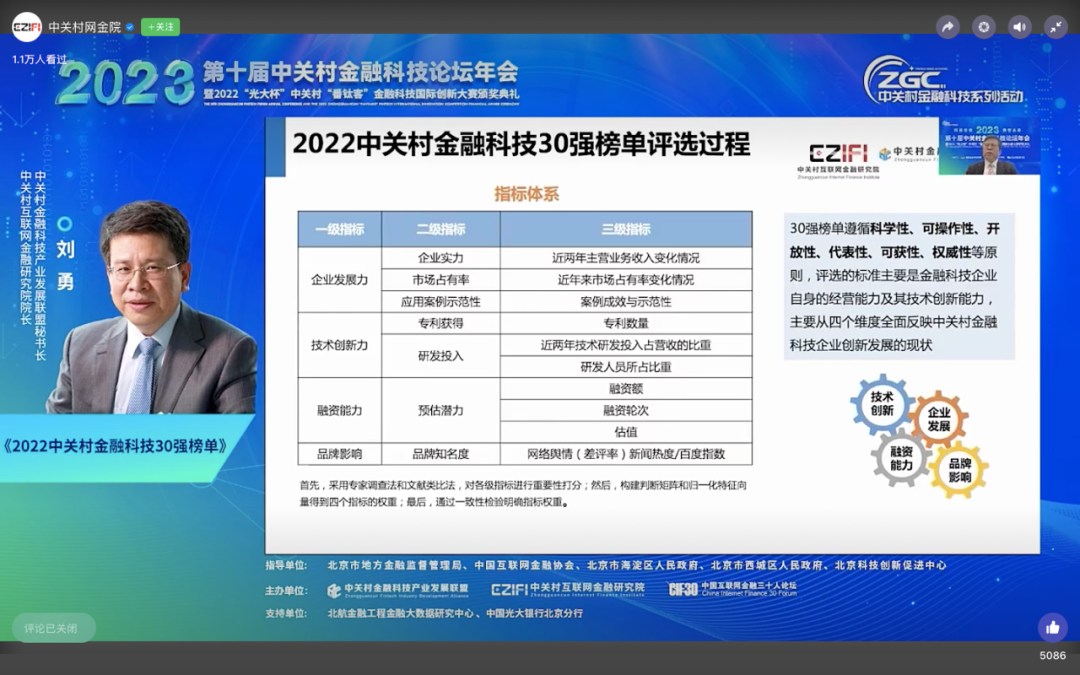 2022年12月13日-14日,由中關村金融科技產業發展聯盟、中關村互聯網金融研究院、中國互聯網金融三十人論壇共同主辦的“2023第十屆中關村金融科技論壇年會暨2022‘光大杯’中關村番鈦客金融科技國際創新大賽頒獎典禮”?在“云端”盛大舉行。本次論壇采用全新線上方式,匯聚行業學者精英,聚焦金融科技前沿熱點問題及發展趨勢,并見證了由中關村互聯網金融研究院和中關村金融科技產業發展聯盟共同主辦的《2022中關村金融科技30強榜單》(簡稱“2022年30強榜單”)的發布。