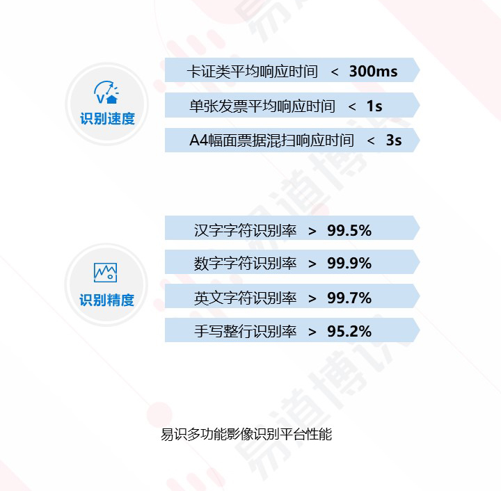 “易識多功能影像識別平臺”是易道博識基于深度學習技術開發的一款機器視覺類智能識別產品集群。平臺涵蓋個人卡證識別、車輛票證識別、財務票據識別、機構文檔識別、通用文檔識別在內的40余款標準DeepOCR識別引擎,可滿足市場主流OCR識別需求,同時平臺還擁有人臉識別及多款數據查驗產品。該平臺內所有產品均為標準產品,用戶可根據行業場景與業務需求自行選擇產品組合,快速私有化部署,開箱即用。針對個性化的卡證、票據、文檔識別與結構化輸出需求,用戶可利用平臺提供的智能模板快速打造專屬識別產品。