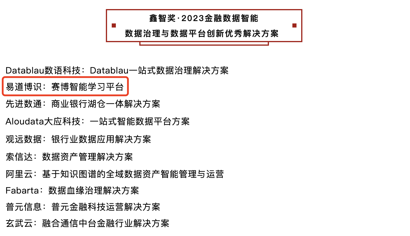 為展示金融企業數據管理和數據平臺智能化轉型成果,分享大數據和人工智能在風控、營銷、產品、運營等場景的落地實踐,探討“金融科技+數據智能”的創新應用和未來發展,在全球金融專業人士協會的支持下,金科創新社主辦了“2023鑫智獎·第五屆金融數據智能優秀解決方案評選”活動。易道博識賽博智能學習平臺解決方案成功入選,并榮獲“數據治理與數據平臺創新優秀解決方案”。