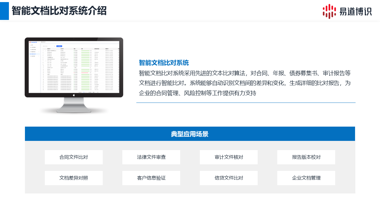 易道博識的智能文檔比對系統是一款集成了先進的文本比對算法的智能工具,能夠對合同、年報、債券募集書、審計報告等多種文檔類型進行精確的比對。系統能夠自動識別文檔間的差異和變化,生成詳細的比對報告,為企業的合同管理、風險控制等工作提供有力支持。該系統不僅可以處理不同格式的文檔,包括圖像、PDF、Word等,還能夠支持段落、大綱、表格、印章等內容的比對。