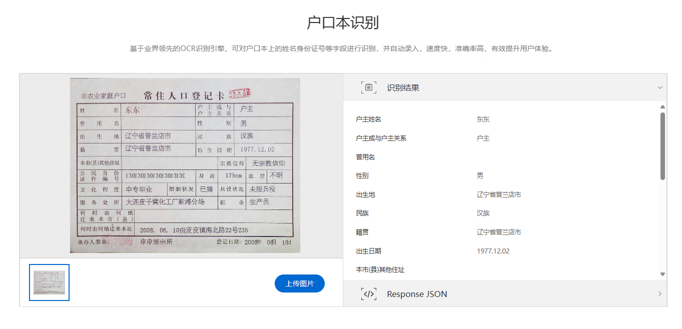 在新生兒建檔、戶口遷移以及個人信貸申請等場景中,戶口本OCR識別展現了巨大的優勢。通過OCR技術,系統能夠自動讀取并解析戶口本上的關鍵信息,如姓名、性別、出生地、出生日期、身份證號等。這一功能大大縮短了信息核驗和登記的時間,同時顯著降低了人工操作帶來的錯誤風險。