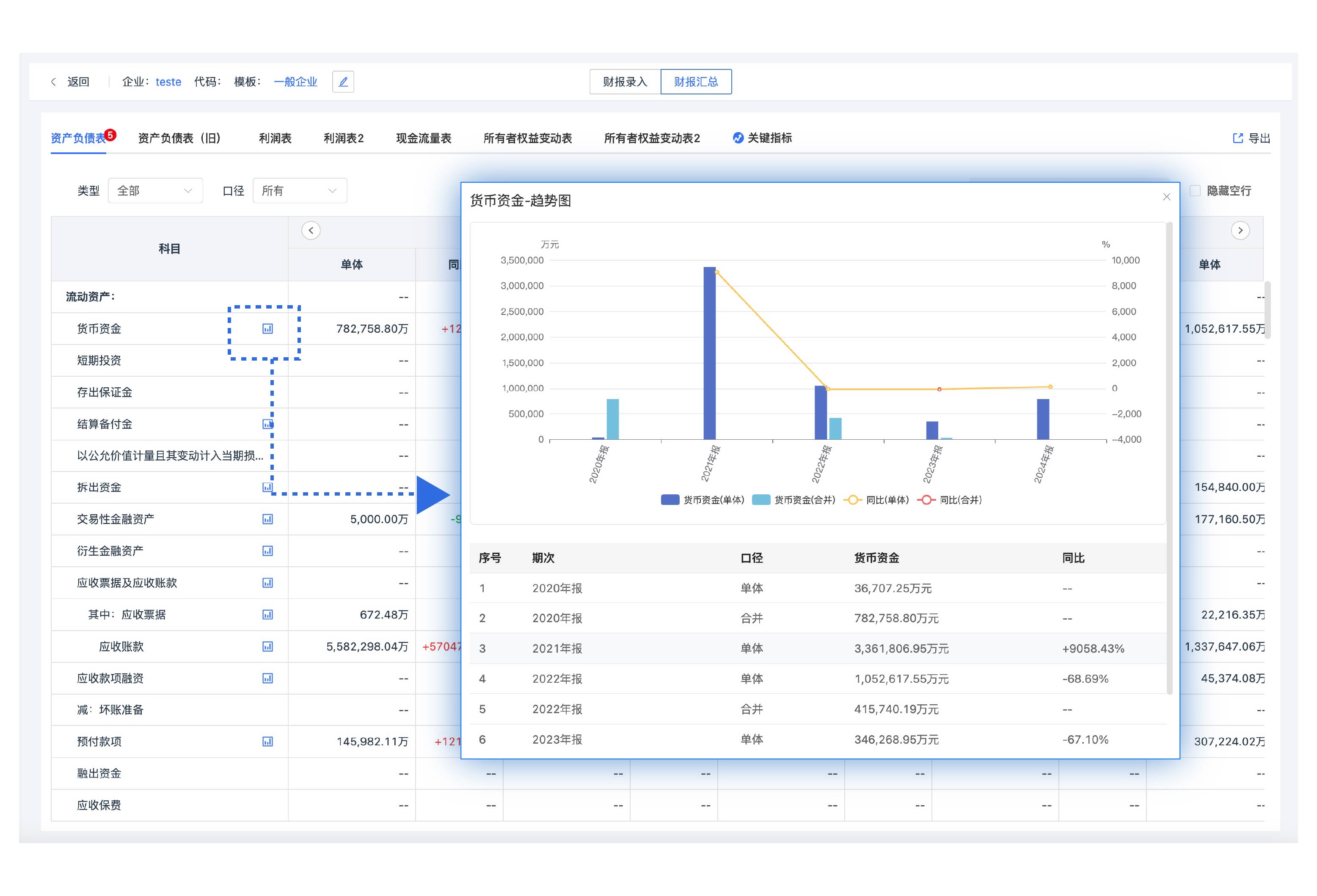 ● 智能分析與報告生成:系統不僅能自動提取三大表數據,還能進行多維度的財務指標分析,對企業的盈利、償債、營運及發展能力進行全景式健康診斷。此外,它還能將復雜的財務數據轉化為直觀圖表,并一鍵生成可導出的財務分析報告。