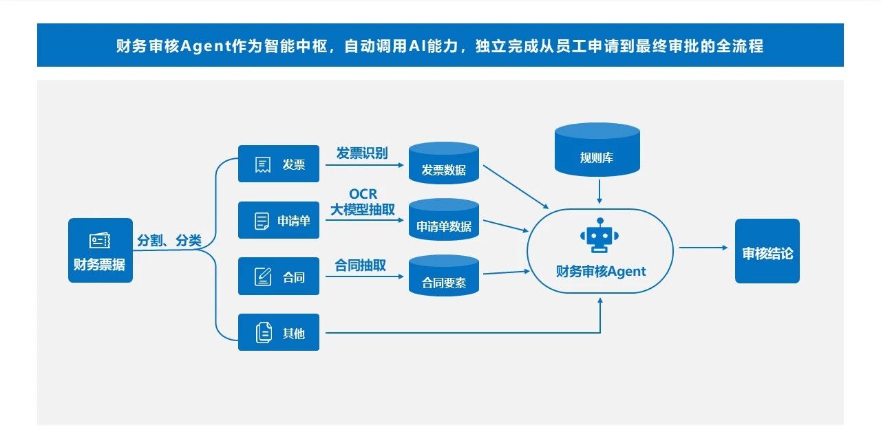 ● 財務審核:財務審核Agent利用大模型的推理能力,結合企業規則進行智能判斷(如費用是否超標、日期是否合規),并自動輸出審核結論