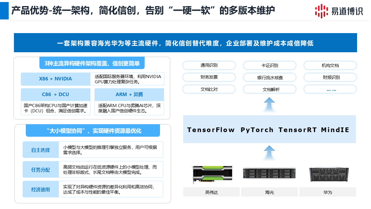 DeepIDP從底層架構原生適配主流國產化硬件,全面兼容C86+DCU、ARM+昇騰等多種體系,解決了傳統OCR引擎在國產化環境中移植成本高、周期長、適配難的問題。