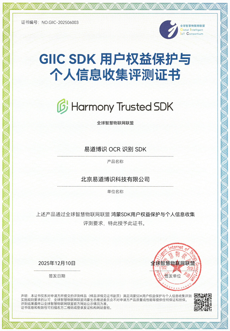 近日,易道博識旗下核心產品——易識移動端識別SDK,通過全球智慧物聯網聯盟(GIIC)鴻蒙SDK權威認證,易道博識將以更安全可信的卡證識別能力,持續賦能企業用戶融入鴻蒙生態。