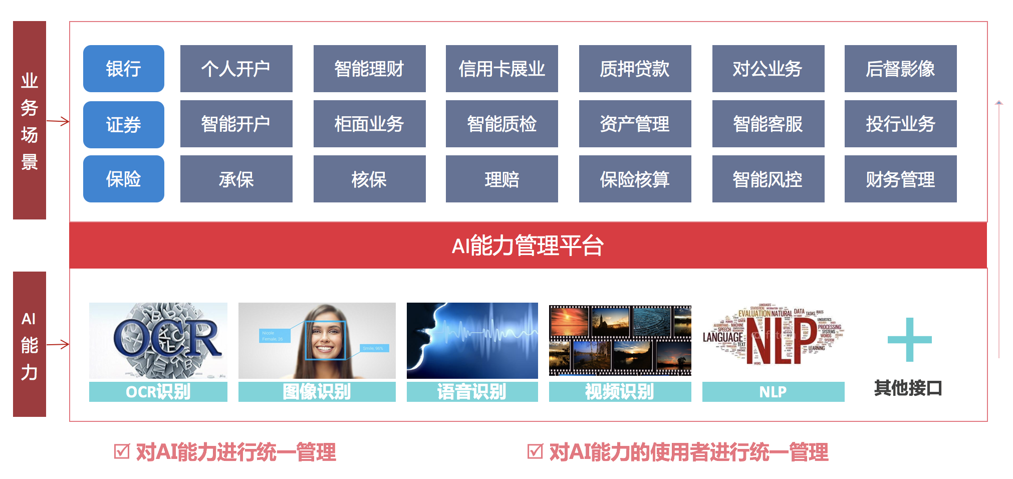 人道“術(shù)業(yè)有專攻”,很多企業(yè)為了追求產(chǎn)品的質(zhì)量,會(huì)分別從不同的專業(yè)供應(yīng)商采購(gòu)AI產(chǎn)品,例如OCR識(shí)別,人臉識(shí)別,語(yǔ)音識(shí)別,NLP等等,可能由不同的廠商提供,但各廠商產(chǎn)品接口存在差異,無(wú)法互聯(lián)互通。還有的大型集團(tuán)企業(yè),總部和分部分別采購(gòu)了不同廠商的某一功能模塊,統(tǒng)一搭建企業(yè)AI能力時(shí)產(chǎn)生各種各樣的兼容問(wèn)題。如何把來(lái)自不同渠道的AI模塊進(jìn)行統(tǒng)一管理?