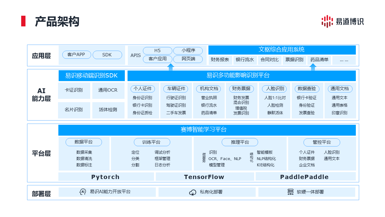 易道博識自成立以來一直致力于人工智能領域的技術研究與應用開發,為適應國產化浪潮,易道博識自主研發全面適配信創產業智能文檔識別方案,依托賽博、易識、文樞及主流軟硬件產品基礎設施,為客戶提供基于信創環境的底層支撐能力,確保客戶在安全的環境下,實現對各類文檔的智能識別和處理,如財務報表、銀行流水、證件、票據等,提高金融機構的工作效率,降低人工成本和安全風險。