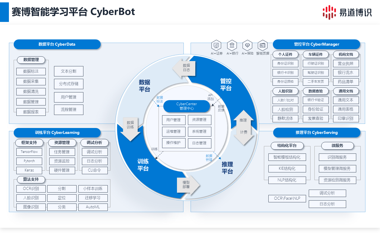 智能文檔處理在金融機構的數字化轉型中扮演著至關重要的角色,不僅提升了業務辦理效率,也顯著降低了人力成本。然而,現有解決方案在靈活性、開發效率和數據安全方面仍面臨挑戰。易道博識通過其“賽博智能學習平臺”提供了有效的解決策略,該平臺集智能數據管理、數據標注、模型訓練和模型部署應用于一體,實現了一站式的機器學習模型訓練與應用。