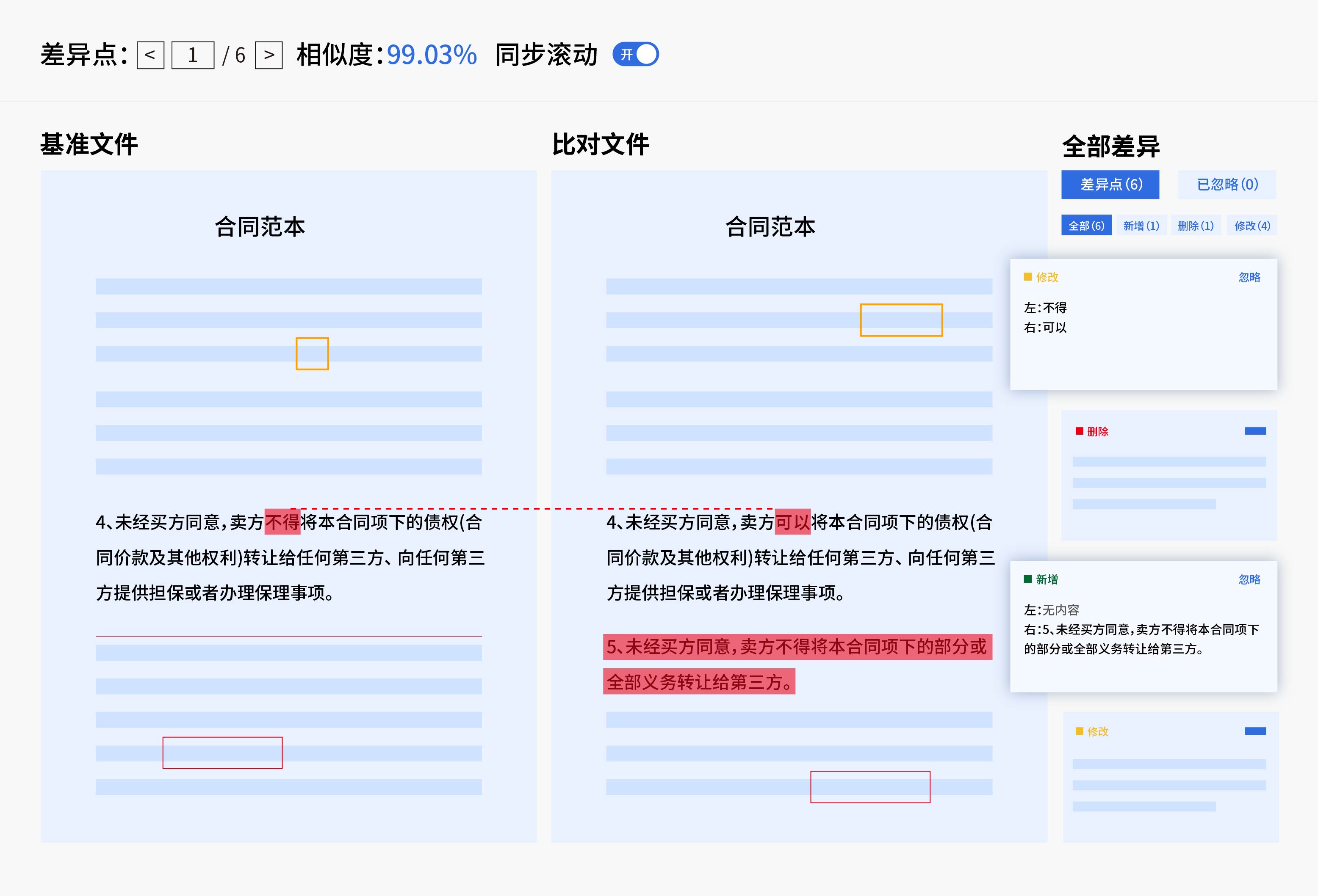 文本差異高亮:全部文本差異匯總查看,快速掌握整體修改情況;還支持分類“增、刪、改”信息查看,差異高亮顯示,核查每一處文本變更。