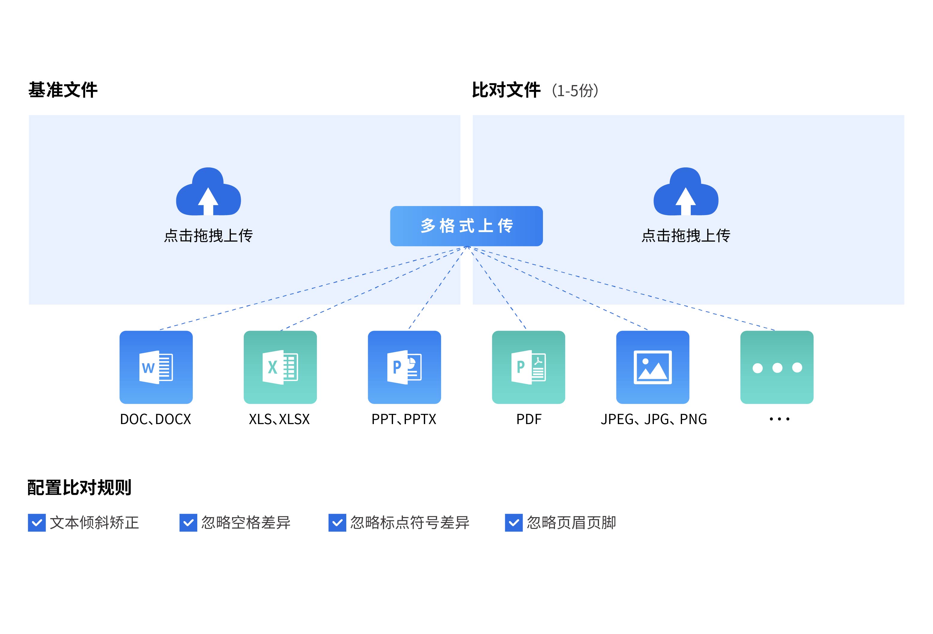 超強(qiáng)格式兼容: 支持DOC、DOCX、XLS、XLSX、PPT、PPTX、PDF等格式文件比對,支持JPEG、JPG、PNG、BMP等圖片格式。