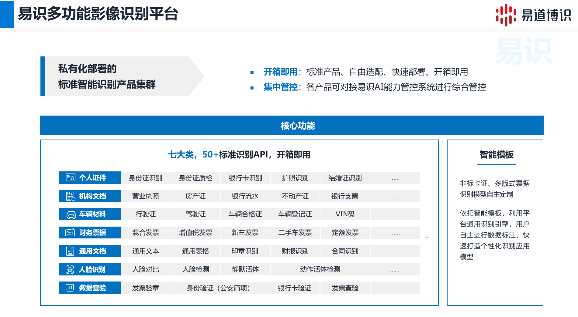 營業執照OCR識別技術的出現,標志著機構開戶流程進入了一個全新的高效時代。易道博識的“易識”產品線基于深度學習技術,提供了強大的OCR識別功能,涵蓋了營業執照、身份證等多種證件識別,包含7大類、50+標準卡證識別,滿足市場主流OCR識別需求,極大地提升了識別效率和準確性。特別是“易識AI能力開放平臺”支持多種卡證識別功能,用戶可以通過調用API接口,輕松實現證件信息的提取與處理。同時,“易識移動端識別SDK”在移動端也能提供與服務器端相當的識別性能,特別適合遠程開戶和移動支付等場景。