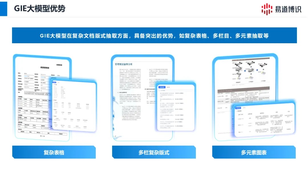而隨著以Transformer架構(gòu)為代表的大模型的興起,文檔處理也迎來了新的發(fā)展機(jī)遇。大模型技術(shù)憑借其強(qiáng)大的語義理解能力、跨模態(tài)學(xué)習(xí)能力和泛化能力,能夠有效克服傳統(tǒng)OCR技術(shù)的局限性,實(shí)現(xiàn)對各種復(fù)雜場景文檔的高精度、高效率識(shí)別和處理。易道博識(shí)正是敏銳地洞察到了大模型在文檔智能領(lǐng)域的巨大潛力,推出了GIE大模型(OCR大模型)。
