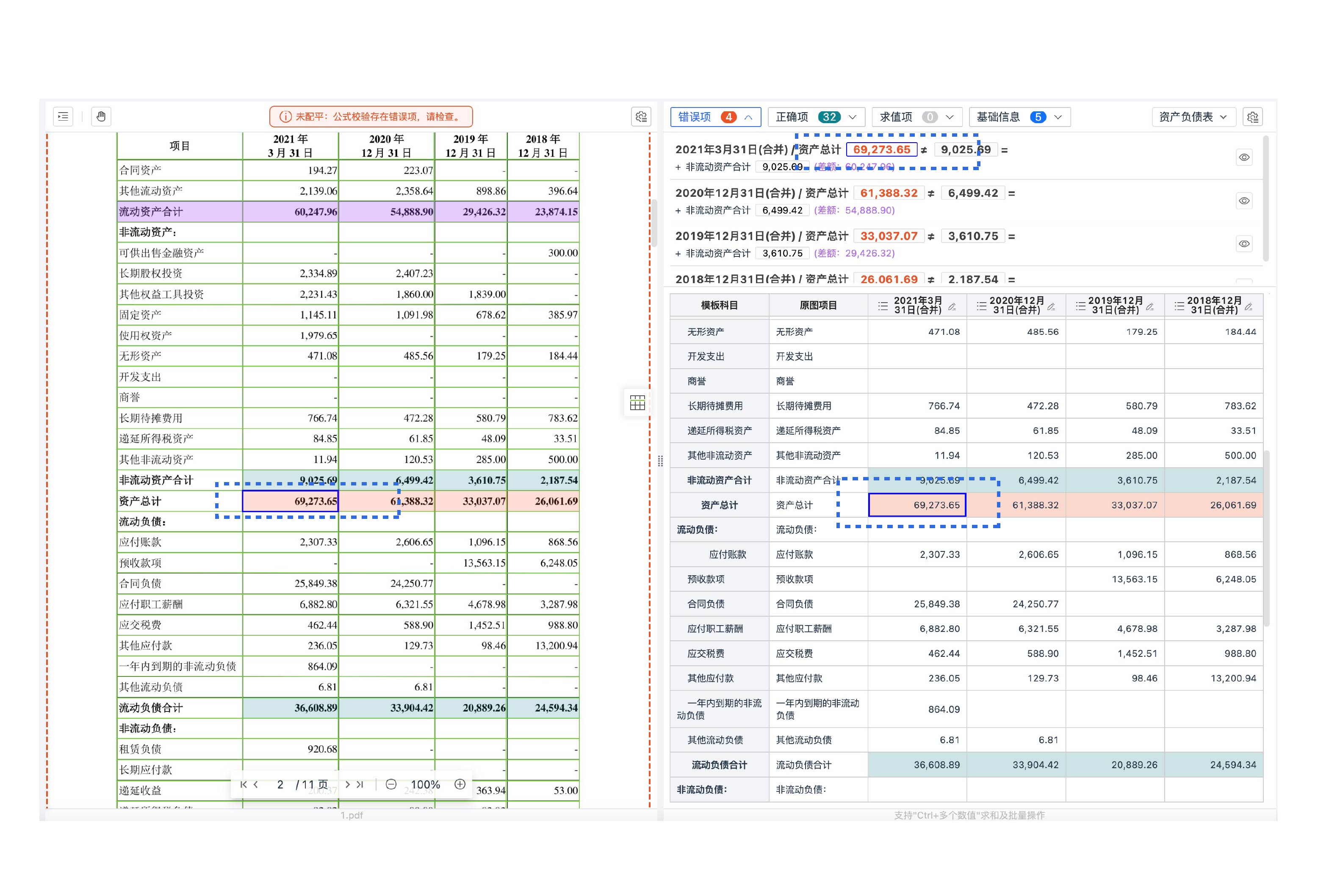基于勾稽關系自動配平校驗,對錯誤項高亮提示。