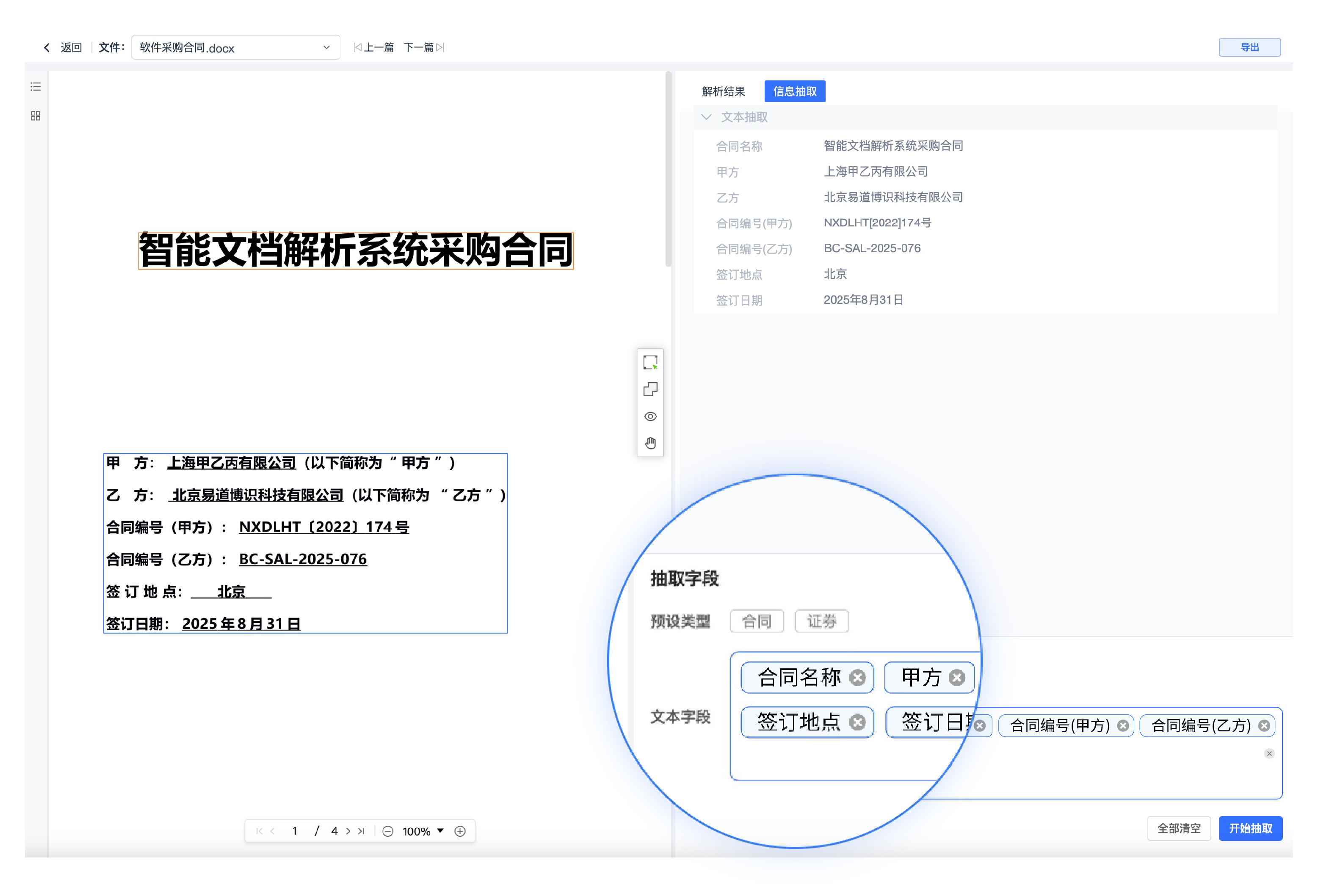 系統內預設模板,并自持自定義抽取,僅需輸入提示詞即可實現任意版式文檔字段抽取。