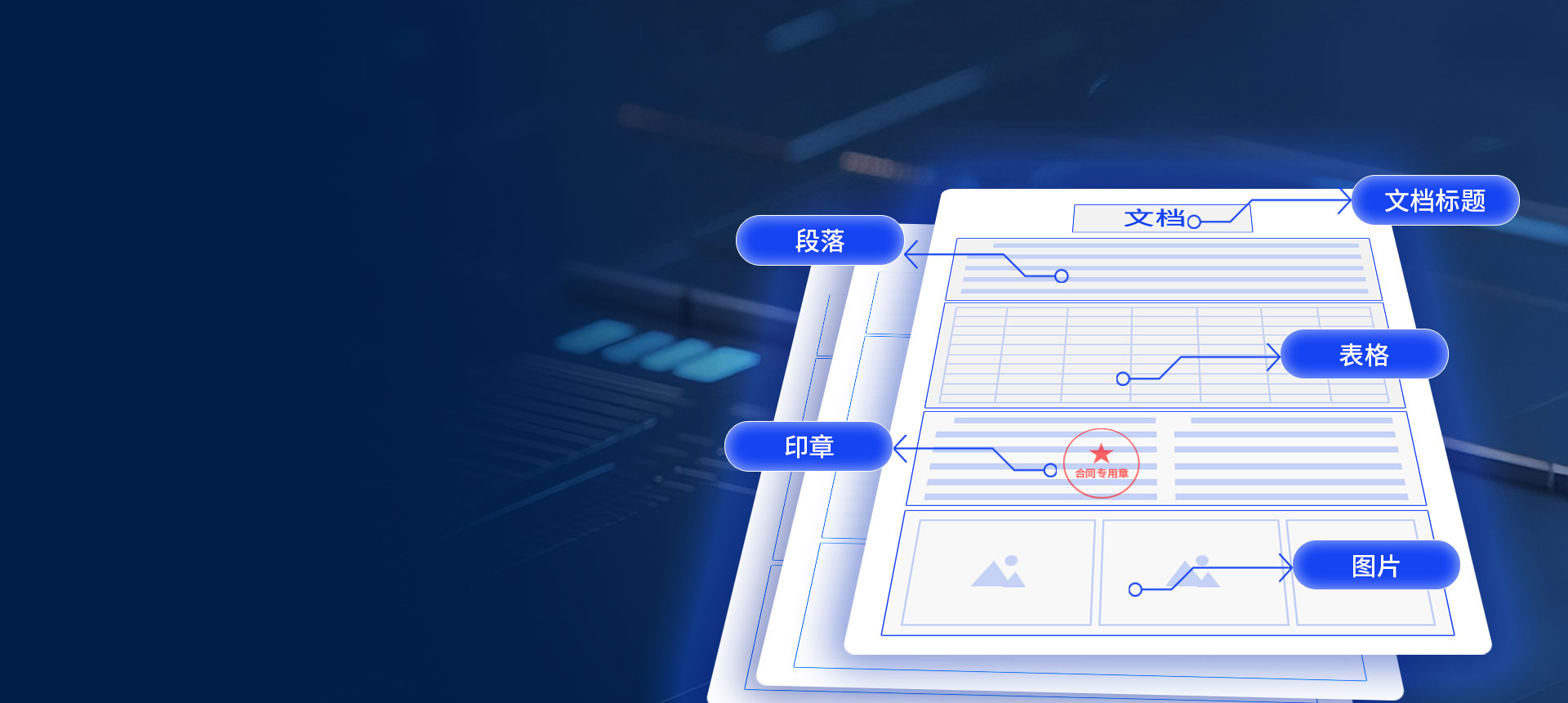 支持批量解析 PDF、JPG、PNG、Word等格式文檔。 精準識別并提取文檔中的各類版面元素,包括標題、段落、目錄、頁眉頁腳、表格、圖片、印章、公式等。